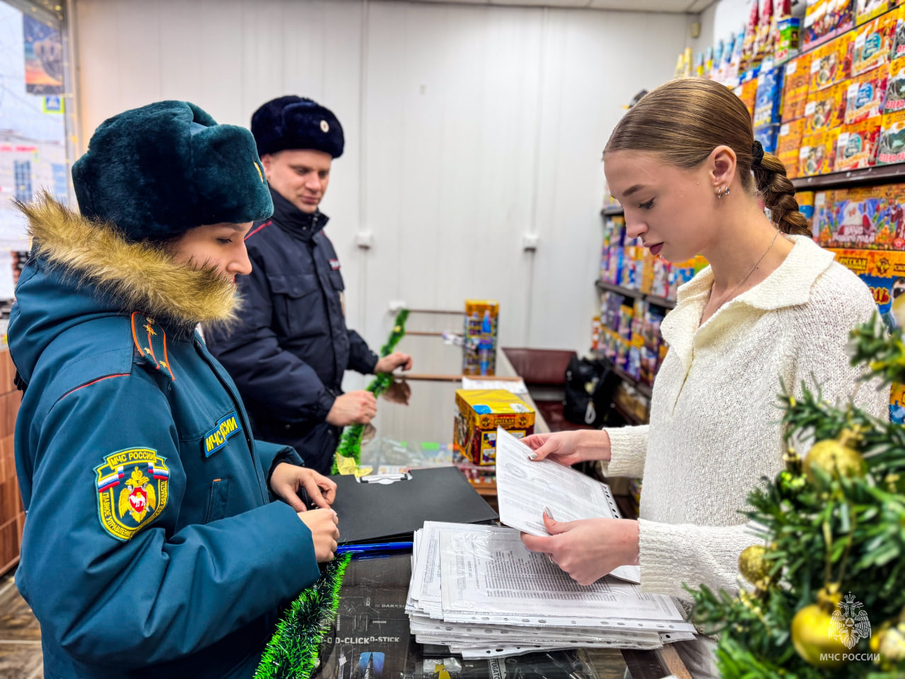 Сотрудники МЧС России совместно с полицейскими проводят профилактические мероприятия в точках продажи пиротехники с целью обеспечения безопасности населения в период праздничных сезонов.