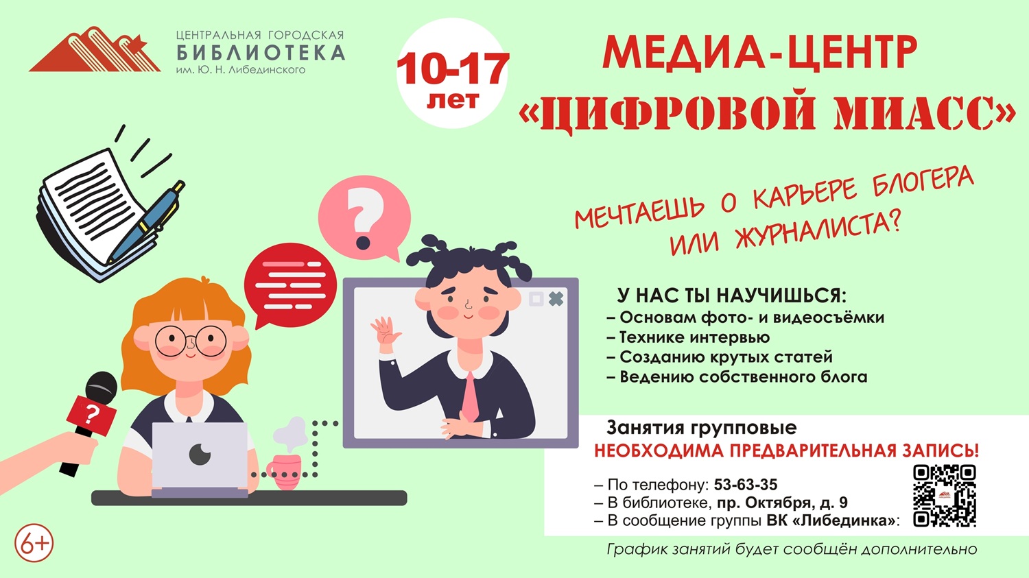 Библиотека им. В.Ю. Либединского объявляет набор детей в новый медиацентр «Цифровой Миасс». Здесь дети смогут освоить самые разные навыки: писать тексты в различных жанрах, снимать и монтировать видео, заниматься фотографией.